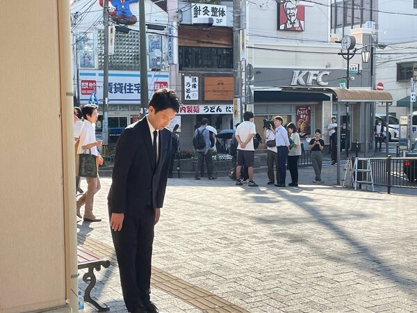 通勤・通学客にひたすらお辞儀を繰り返す斎藤元彦・前知事。背景ではテレビクルーが県民にインタビューする姿も