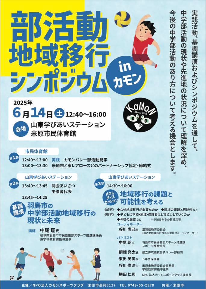 中学校の部活動は、過去から現在に至るまで各中学校の教員が、各中学校の体育館や運動場で指導されてきました。しかしながら、教員の負担が増すばかりで、今後は各中学校ではなく、例えばカモンスポーツクラブ様のようなNPO法人、米原市などが教員に代わり部活動の主体的な役割を目指すものです。