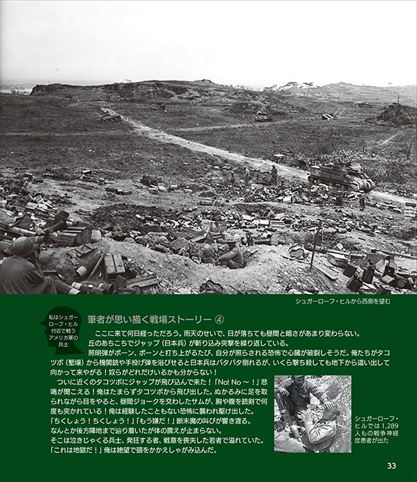 書籍では、戦闘の流れを追いつつ、主な戦場となった地点を、当時と現在の写真を並べて紹介している。「今はこんなに人が住んでいる本島中南部で、80年前にこんな戦いがあったのか、と読む人にも想像してほしい。タイムスリップしたような感じになってくれたら」。下地さんが思い描いた戦場ストーリーも掲載し、当時の状況がより立体的に浮かび上がる一冊となっている。