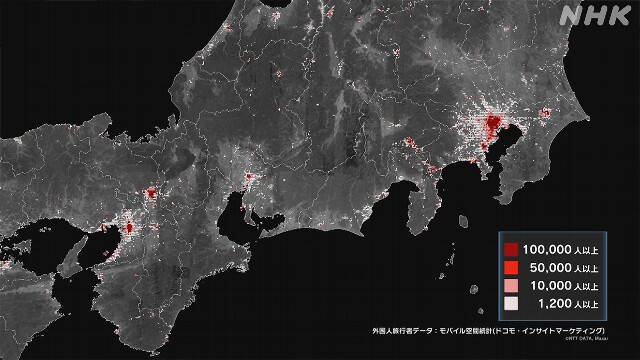 この地図は、外国人旅行者がどこに多く足を運んだのかを1キロ四方ごとに分析したデータです。携帯電話の基地局からプライバシーを保護した形で集めその人数を推計しました。