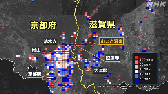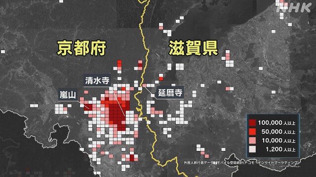 一方、滋賀は、世界遺産の比叡山延暦寺などは薄い赤色になっていますがほとんどが白色。県では、京都を訪れる外国人旅行者が滋賀に流入すれば、こうした現状を変えるチャンスになると考えています。