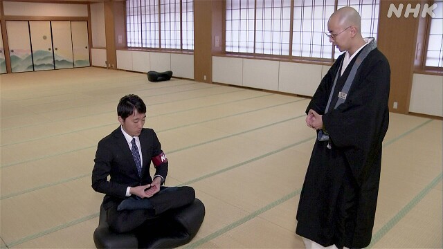 僧侶が悩みを聞いたうえで、座禅などの8つの修行の中からそれぞれに合った内容を勧めます。