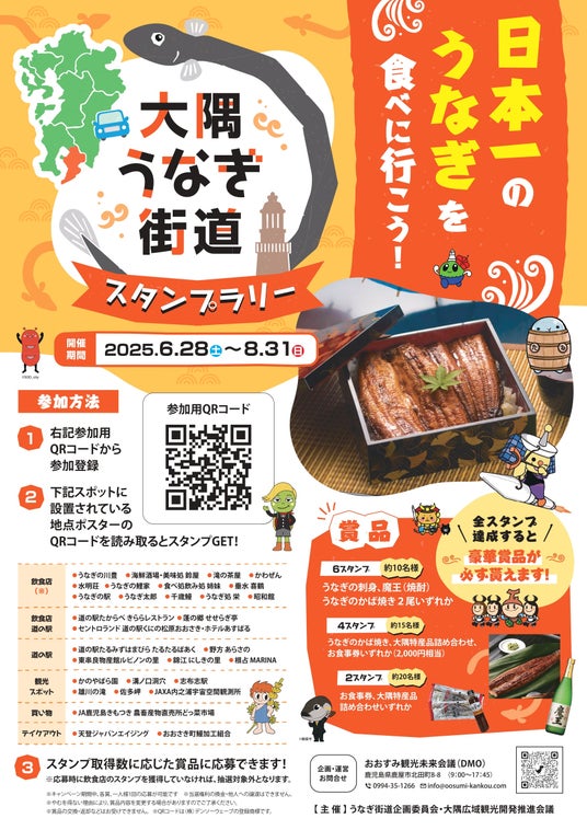 期間中、うなぎの名店や観光スポット、道の駅を巡りポイントを獲得!ゲーム感覚で楽しめるデジタルスタンプラリー、新たに開設するInstagram「大隅うなぎ街道」をフォローするだけで賞品が当たるフォローキャンペーンに参加していただくと抽選でうなぎの刺身や蒲焼、大隅特産品をプレゼントいたします。