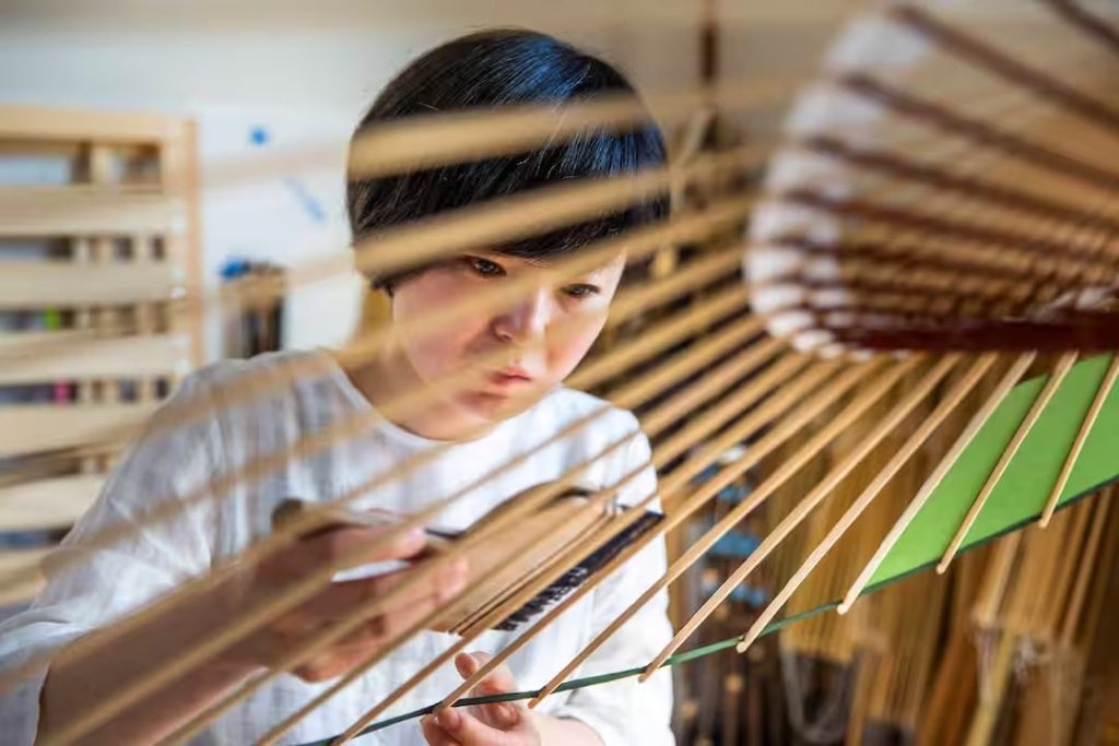 河合さんは、分業制が定着している和傘制作において、竹骨を1本ずつつなぐ「組み立て」、和紙を糊(のり)付けする「張り」、和紙に油をしみこませて天日干しし、内側を糸でかがる「仕上げ」までの全工程を1人で完遂できる数少ない職人。機械は使わず手作業だけ。油を塗る工程がない日傘でも2カ月、より手間がかかる蛇の目傘なら2カ月半、完成までに要する。