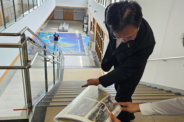 また、大洲市東大洲では、平成30年7月豪雨(西日本豪雨)による浸水状況とその後の対策工事について説明を受け、整備された肱川支川矢落川の堤防等を視察したほか、西予市の乙亥会館では「NIPPON 防災資産」に指定された災害の教訓を伝承する活動について説明を受け、同施設内の災害伝承展示室を視察しました。