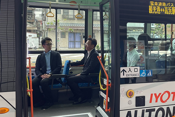 松山市では、伊予鉄バスが運行するレベル4自動運転バスを視察し、自動運転バスの事業概要や車両の説明を受け、自動運転バスに乗車しました。