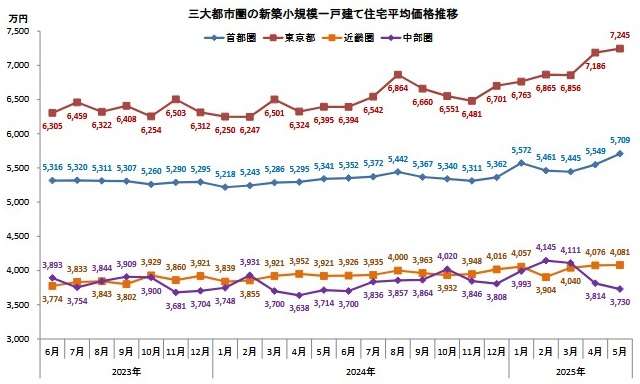 東京カンテイ(東京都品川区)は6月9日、主要都市における5月の新築小規模一戸建て(土地面積50㎡以上100㎡未満)の平均価格動向を発表した。首都圏・近畿圏は連続上昇、中部圏は連続下落した。
