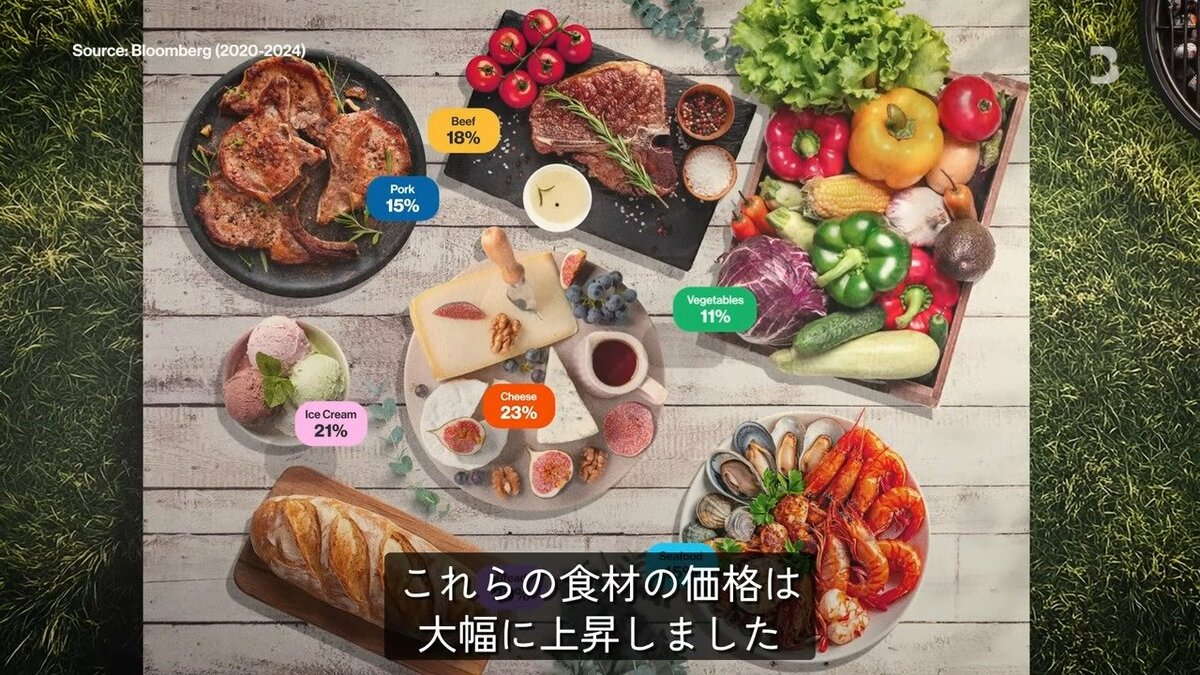 ブルームバーグが発表する「バーベキュー指数」(バーベキューに使う食材の価格を測る指数)を見ると、2020年の創設以来、豚肉、牛肉、アイスクリーム、チーズ、野菜などの価格は大幅に上昇しています。
