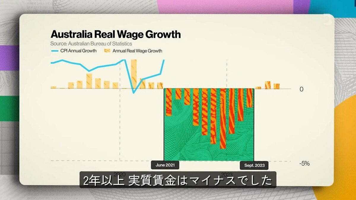 統計を見ると、オーストラリアのインフレ率は上昇していますが、インフレを考慮した実質賃金は2年以上もの間マイナスで推移しています。