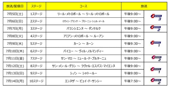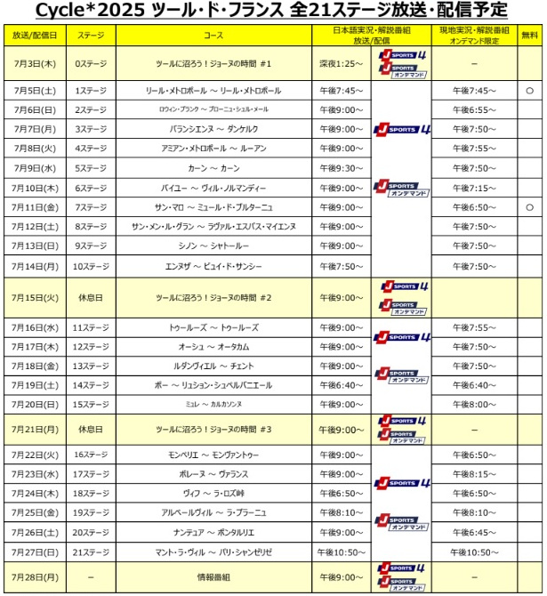なお、J SPORTS 4での全ステージ放送のほか、7月5日(土)の第1ステージから7月14日(月)の第10ステージまで、J SPORTS 1~J SPORTS 3のいずれかのチャンネルでも生中継します。また、オンデマンド会員限定サービスでは、スタートからフィニッシュまでの全行程を現地実況・解説を英語でお届けする番組もお楽しみいただけます。