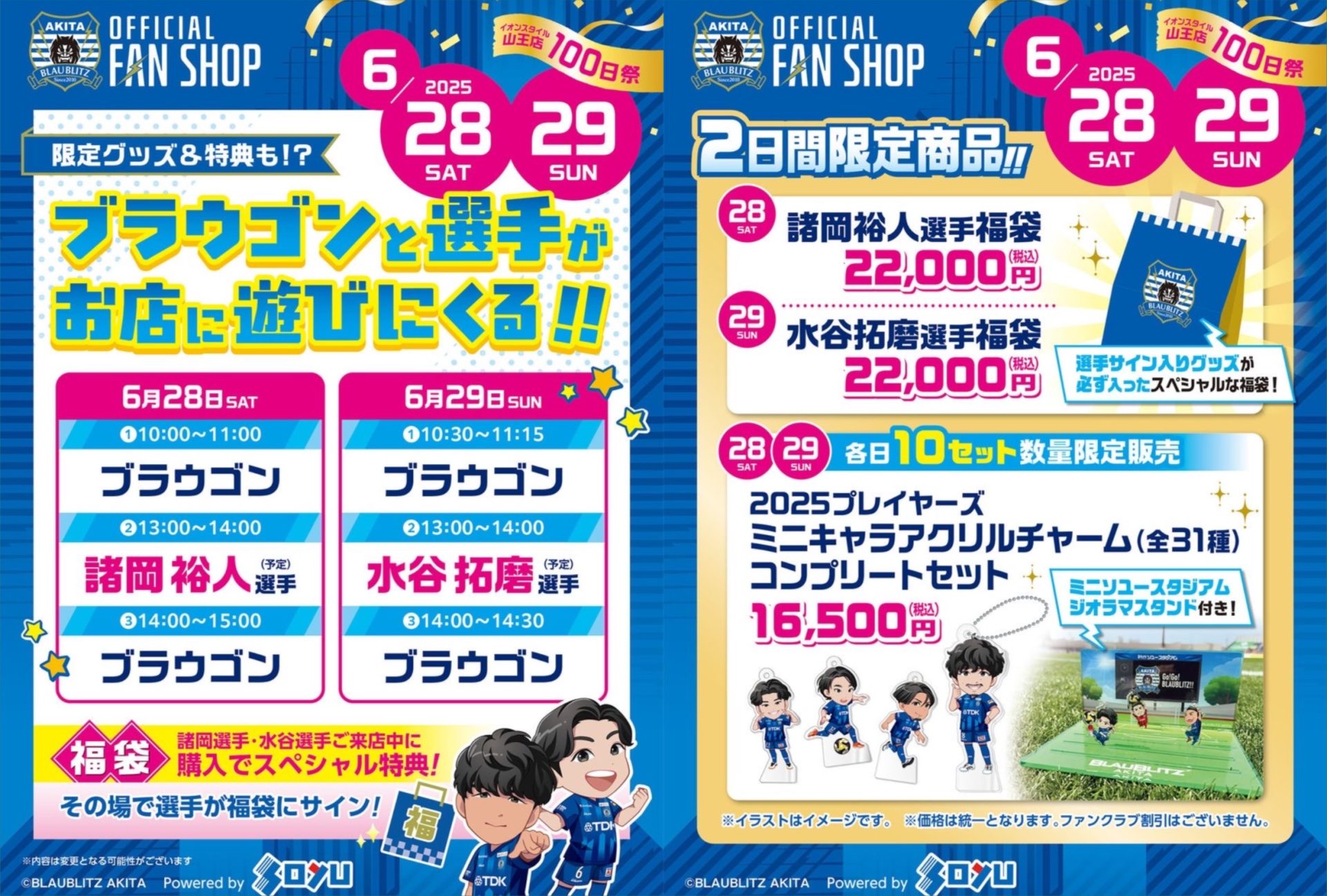 この度、ブラウブリッツ秋田オフィシャルファンショップがある「イオンスタイル山王」オープン100日を記念し、「イオンスタイル山王100日祭」が開催されることになりました。