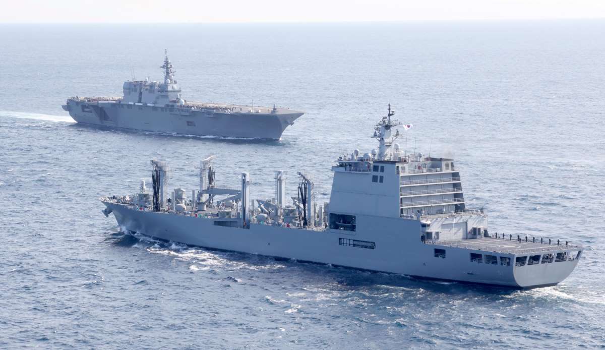 国際観艦式で護衛艦「いずも」の観閲を受ける韓国海軍の補給艦・昭陽(ソヤン、手前) =11月6日午前、神奈川県沖の相模湾(海上自衛隊ヘリから・春名中撮影)