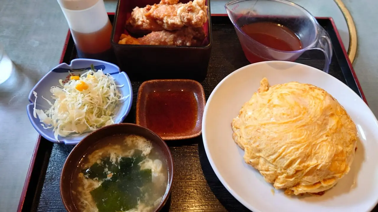 大きな天津飯、味噌汁、サラダ、巨大な唐揚げ2個がついて、これまたボリューミー!