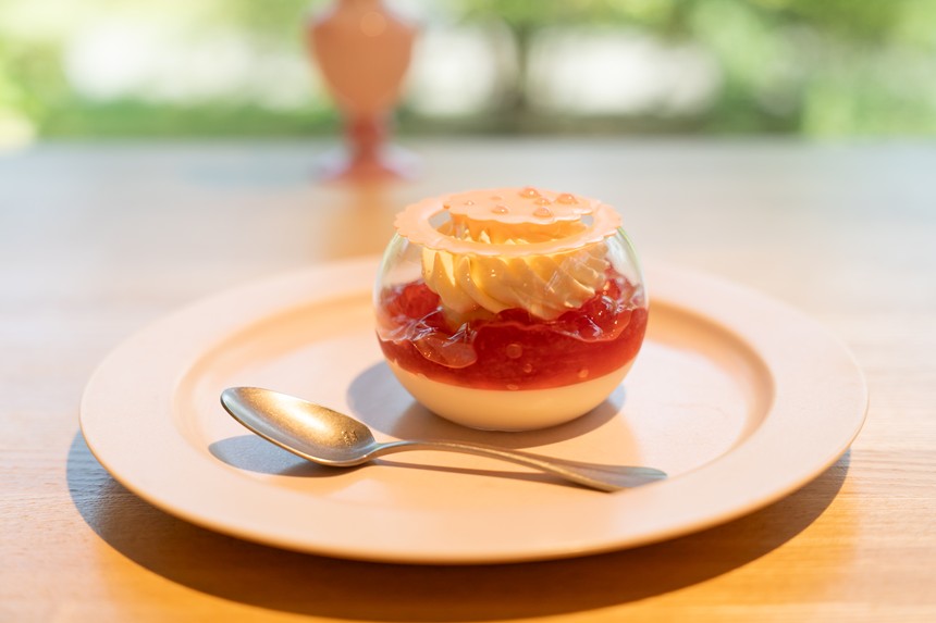 どんな味かと思ってたらチーズケーキがベースなんですね、美味しそう。差し色のローズジュレが透明感があって涼しげですね!