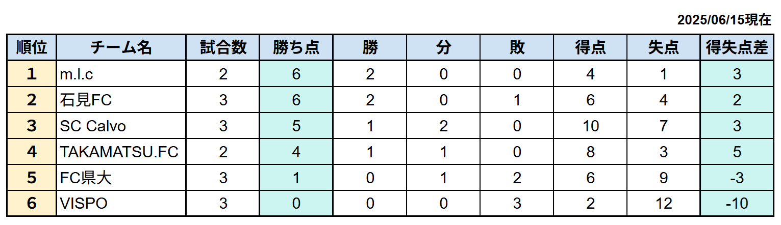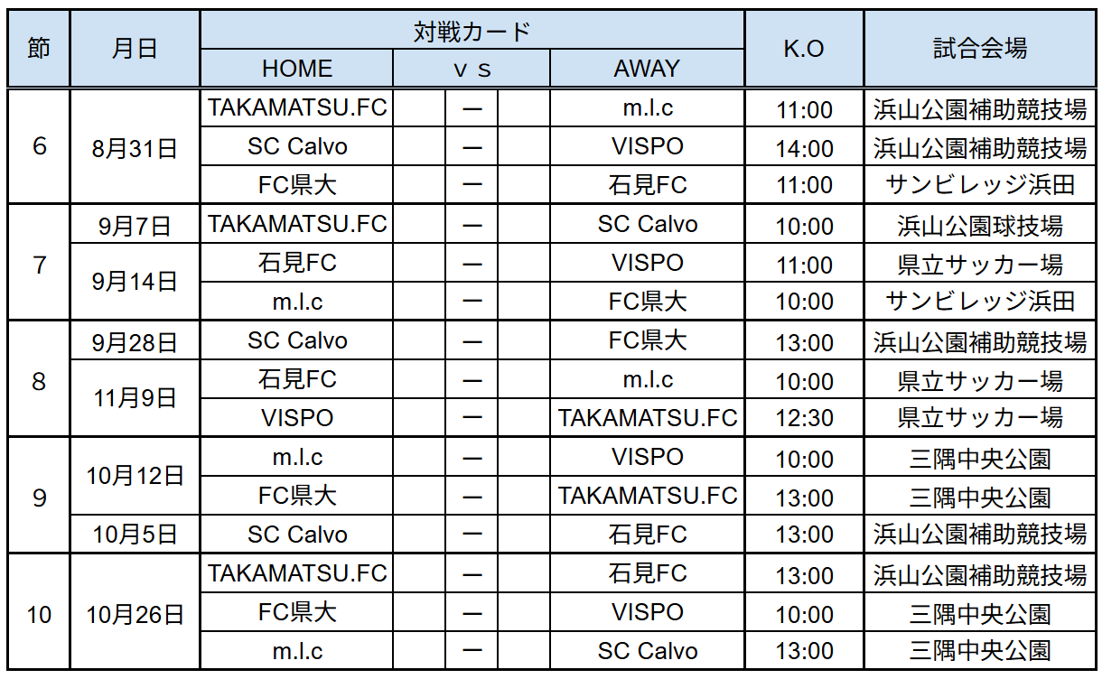 前年度1部・6位のTAKAMATSU.FCが2部に自動降格しています。また昨年の地区リーグ決勝大会で1位だったFC県大が2部に昇格。