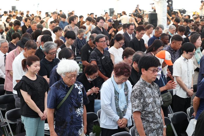 沖縄戦で組織的な戦闘が終結したとされる「慰霊の日」の23日、「戦後80年沖縄全戦没者追悼式」(県・県議会主催)が午前11時50分から糸満市摩文仁の平和祈念公園で始まった。参列者らは正午の時報に合わせて黙とうした。