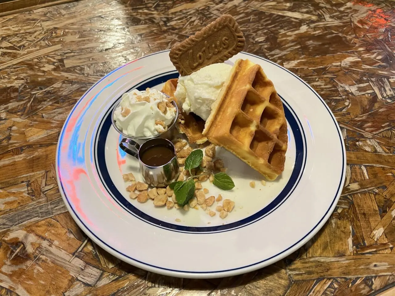 今回注文したクラシックワッフルにはキャラメルソースが付いており、アイス&ホイップ&キャラメルソース&クッキー&ナッツ&ワッフルの相性は格別です。