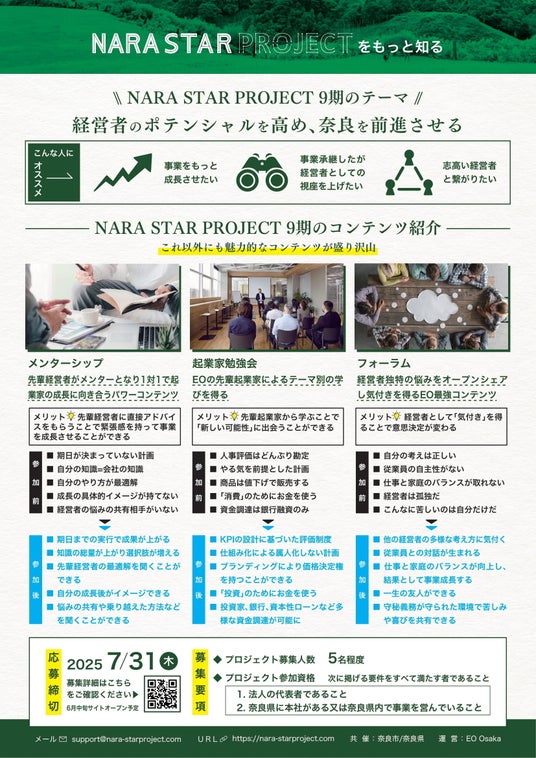 奈良市は、成長志向を持ち、地域に新たな産業を生み出す起業家・経営者を育成する「NARA STAR PROJECT」の9期生を募集します。本事業は、成長した起業家がその経験や人脈を生かし、後輩起業家を育成支援することで持続的に起業家を支援する循環を築くことを目的に実施しており、今年で9年目を迎えます。