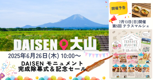 2025年6月26日(木) 10:00より、モニュメント前の芝生広場にて「DAISEN モニュメント完成除幕式」が開かれます。参加された方先着100名には粗品をプレゼント。その他、熟成乾塩ベーコンのふるまいもあります。