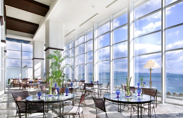 海を一望できる最上階のレストランで、こだわりのスイーツや料理を味わってみて。