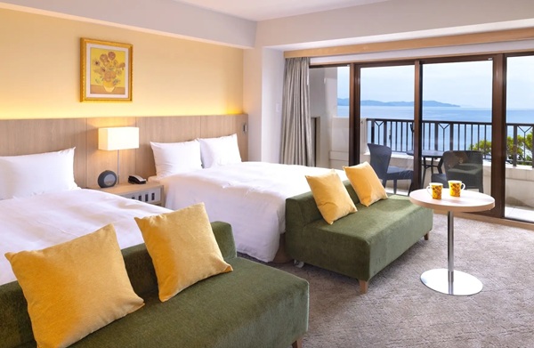 客室は15タイプで、徳島の伝統工芸「大谷焼」のアートプレートが飾られた客室や、アートギャラリー「ゴッホのヒマワリルーム」などもある。