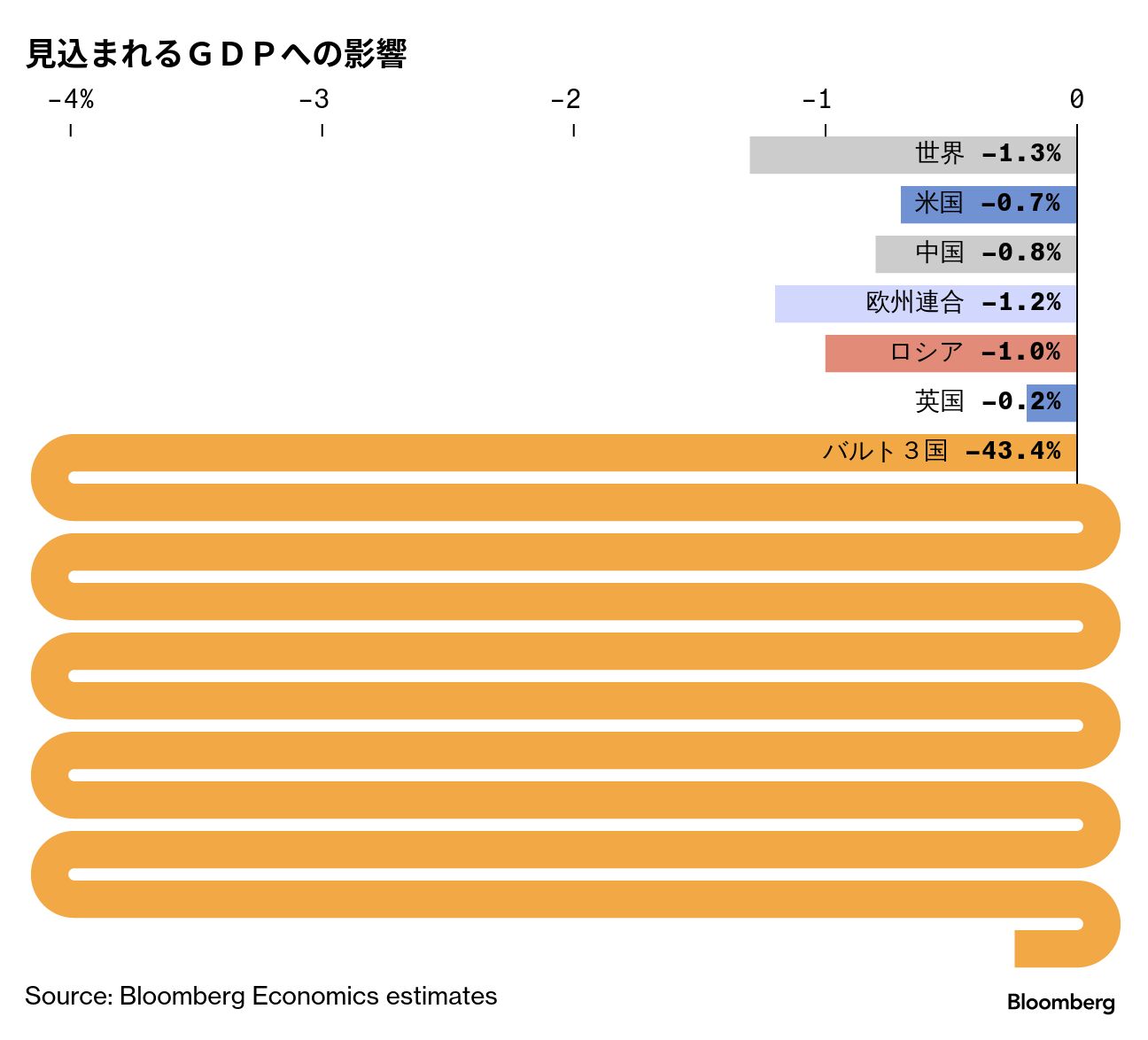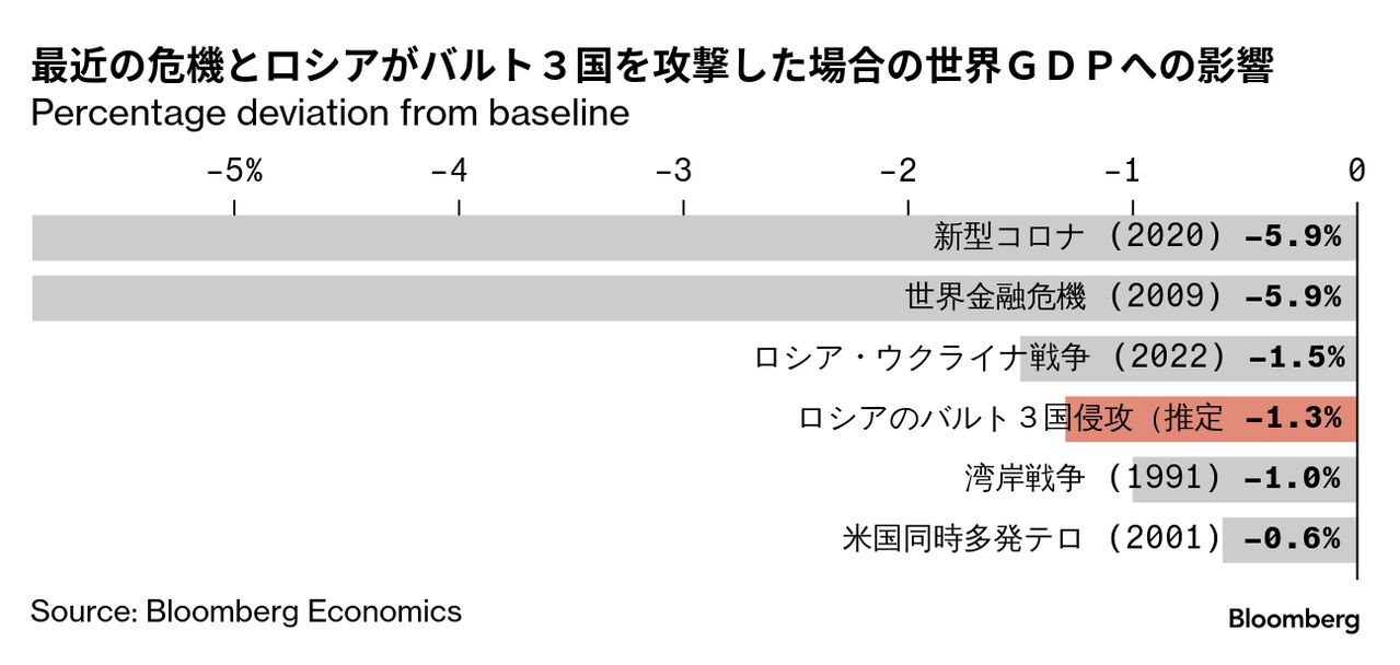 ブルームバーグ・エコノミクス(BE)の試算によると、戦闘地域での破壊による直接的な費用、ロシアの供給が止まることによるエネルギー価格の上昇、金融市場の急落などで戦争初年度に1兆5000億ドル(約218兆円)の経済損失が発生し、世界の合計国内総生産(GDP)は1.3%押し下げられる。これはロシアによるウクライナ全面侵攻の衝撃とほぼ同じ程度だ。戦争が3国以外の欧州諸国にも拡大すれば、経済損失ははるかにもっと膨らむ。