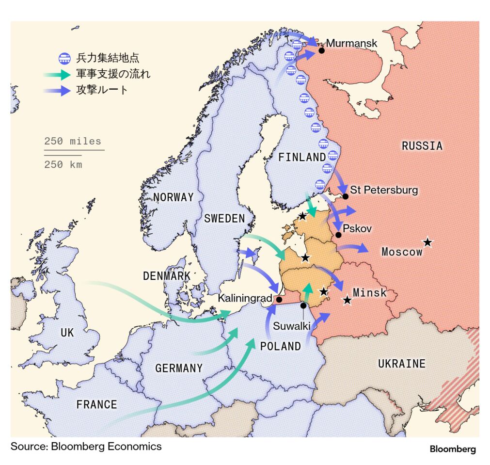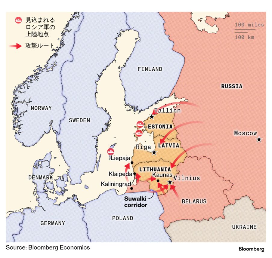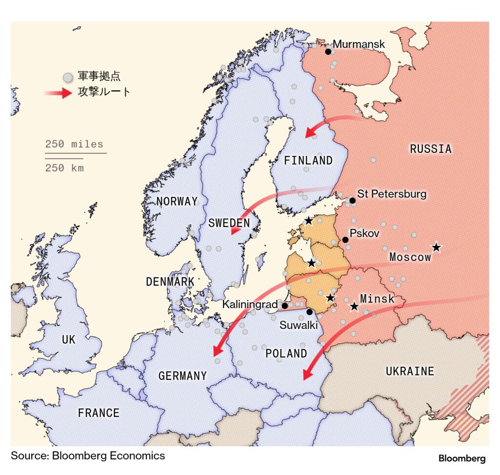 こうしたシナリオでは、NATOの北東端に位置するエストニアとラトビア、リトアニアで衝突が起きる可能性が最も高そうだ。バルト3国は欧州経済のわずかな一部でしかないが、戦略的には重要な地位を占める。