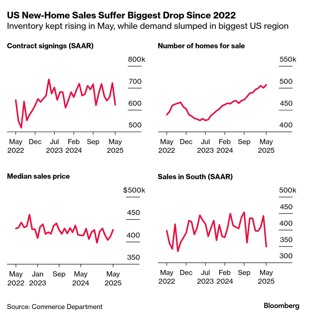 5月の米新築住宅販売は前月比で減少。減少率はここ3年近くで最大となった。販売促進策が相次いだものの、費用面での住宅購入の厳しさを和らげるには不十分だった。