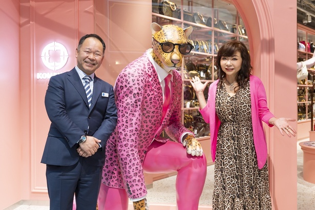 イメージキャラクターのヒョウさんに合わせ、ヒョウ柄のワンピースにピンクのカーディガンで現れたモモコさんは、「最寄り駅から近く、お店が目立つので迷わずに来ることができました」と立地のよさをアピール。