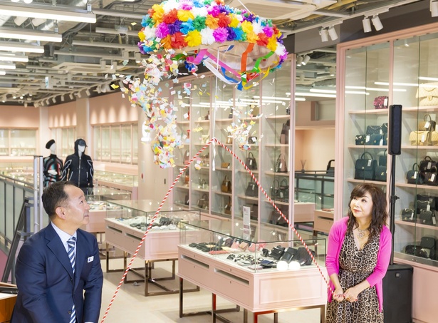 オープニングセレモニーでは、ハイヒール・モモコさんが報道陣にお菓子を配りながら登壇。名古屋生まれのコメ兵にちなみ、家を建てたときや結婚式でお菓子を配る名古屋の風習になぞらえたそうだ。