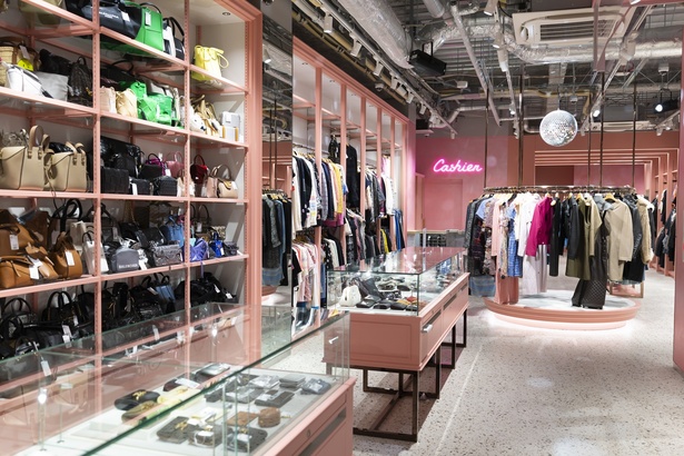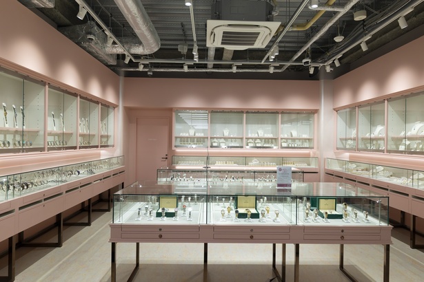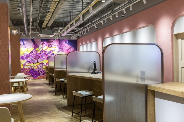 3階の買取フロアはまるでカフェのような空間で、正面からではなく斜めにスタッフと対面できるよう工夫された買取カウンターが4つある。また、壁面を落ち着いたピンク色にしたり、一部を鏡張りにしたりと、開放感があり心理的な負担を感じにくい設計に。「初めての買取でも不安がないようにしたい」という想いが込められているのだとか。