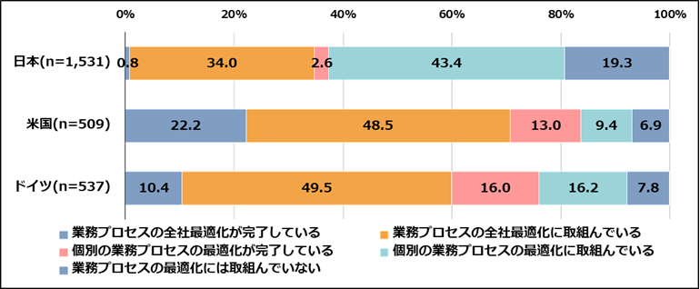 業務プロセスの最適化に関する取組方針について尋ねたところ、日本は個別の業務プロセスの最適化に取組む割合が高く、米国とドイツは業務プロセスの全社最適化に取組む割合が高いことが分かりました。