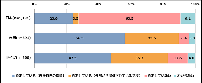 DXによる成果を把握するための指標を設定しているかを尋ねたところ、日本は「設定している」(「自社独自の指標」と「外部から提供されている指標」の合計)の回答割合の合計は3割以下でしたが、米国とドイツは共に8割以上となっており、指標の設定において大きな差が見られました。