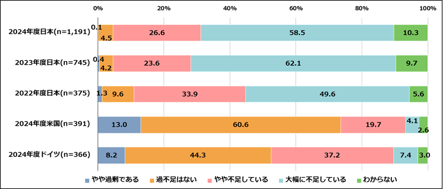 DXを推進する人材の「量」の確保状況について尋ねたところ、日本は不足している割合(「やや不足している」「大幅に不足している」の回答割合の合計)が8割超えており、大半の企業でDXを推進する人材が不足している状態となっています。2023年度調査の結果と同様の傾向となっており、状況に大きな変化はないことが分かりました。また、米国とドイツにおいては「やや過剰である」「過不足はない」の回答割合の合計がそれぞれ7割と5割程度となっており、人材不足が日本ほど深刻な状態にはなっていないことが分かりました。