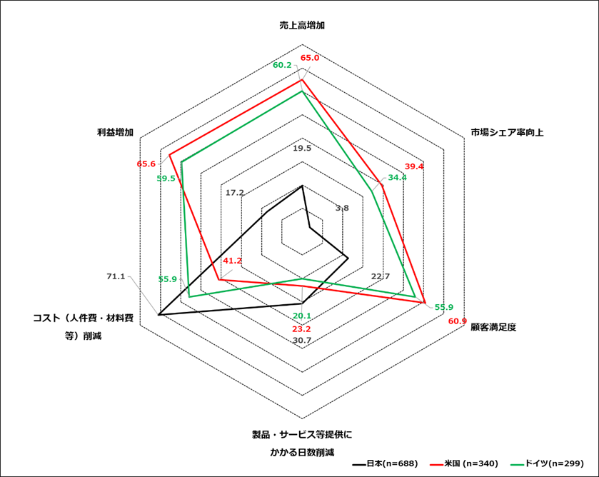 DXによる経営面での成果についてどのようなものがあるかを尋ねたところ、日本は「コスト(人件費・材料費等)削減」「製品・サービス等提供にかかる日数削減」といった生産性向上や業務効率化のような内向きの取組みに関する成果が多い傾向がありました。他方、米国とドイツは「売上高増加」「利益増加」「市場シェア向上」「顧客満足度」といったバリューアップを中心とした外向きの取組みに関する成果が多い傾向があることが分かりました。