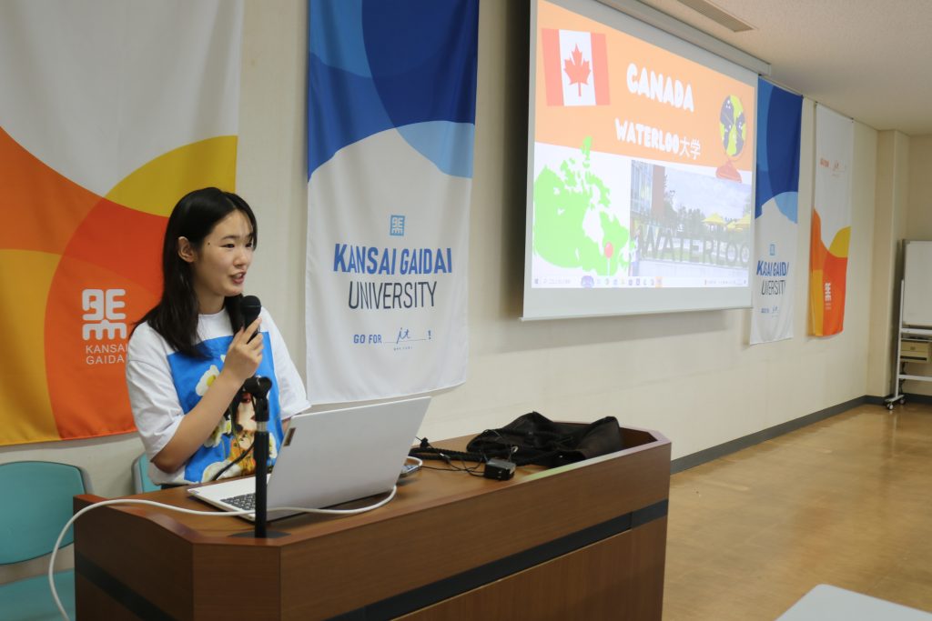 2024年春学期にカナダ・ウォータールー大学へ語学留学した英語国際学部英語国際学科4年の篠倉彩華さんが6月25日、「FIND」の講演で自らの体験を語り、留学を目指す外大生の「本当に英語力は伸びるの?」「就職活動は間に合うの?」といった疑問や不安に具体的に答えました。