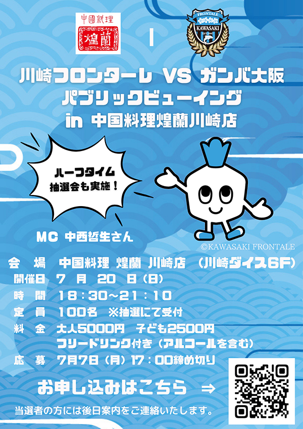 7月20日(日)明治安田J1リーグ第24節 ガンバ大阪戦の「パブリックビューイング」を中国料理 煌蘭 川崎店(川崎ダイス 6F)にて開催いたしますので、お知らせいたします。