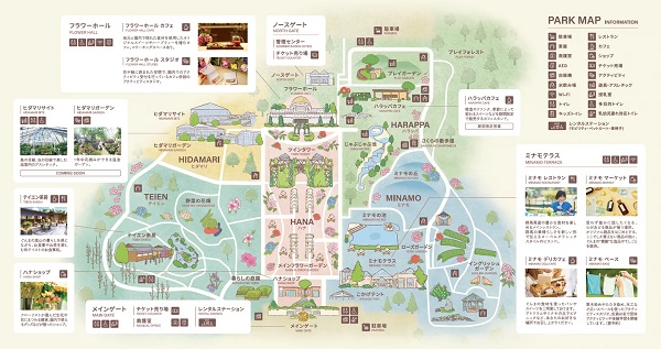 東京ドーム約4個分(約18.4ha)の広大な土地には、5つの飲食施設、2つのアクティビティスタジオ、2つのマーケットがあり、「HANAエリアで花摘みアクティビティとフラワーホールカフェでティータイムを満喫する休日の午後」や「ミナモの丘でピクニックをし、プレイガーデンで子どもとあそぶ1日」など、思い思いの時間を過ごすことができる。