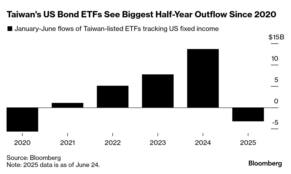 ブルームバーグがまとめたデータによれば、台湾で米債に連動するETFは4月まで3カ月連続の資金流出を記録。5月に小幅な回復を見せたものの、6月には再び資金の引き揚げが起きた。