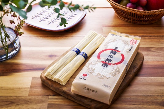 三輪素麺の最大の特徴であるのどごしと歯ごたえをお楽しみいただけます。 オリジナルブレンドの小麦粉、イタリアから直輸入したエキストラバージンオリーブオイル、強い粘りにかかせない国産の塩と厳選された素材のみを使用し、こだわりの製法「本腰熟成製法」で製麺した手延べ素麺。