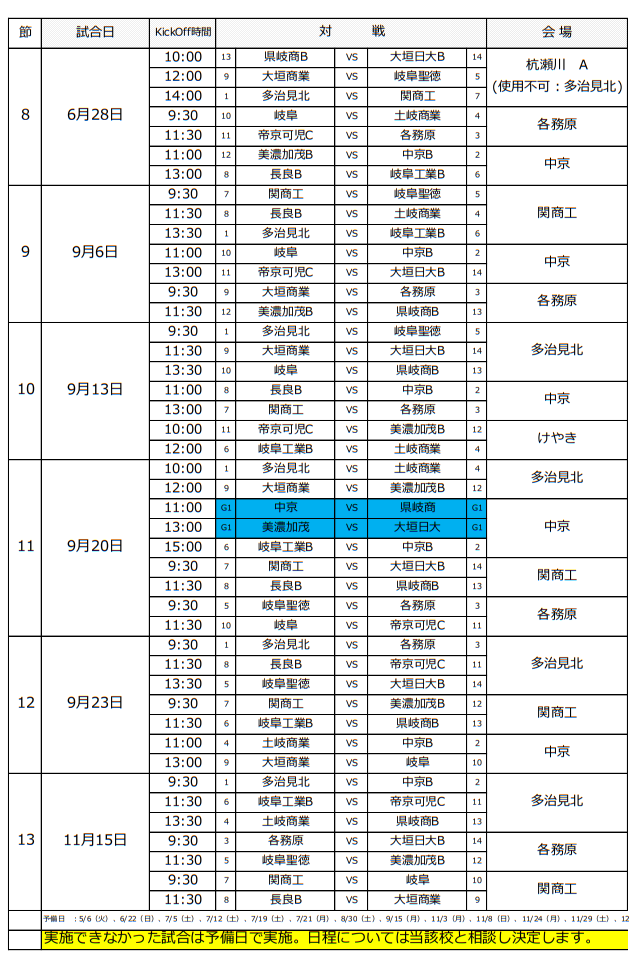 大垣日大、中京、FC岐阜、美濃加茂、岐阜工、長良、県岐商、大垣工、岐阜第一、帝京大可児B