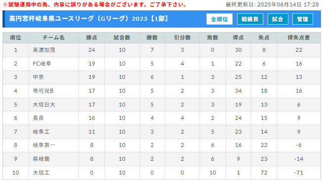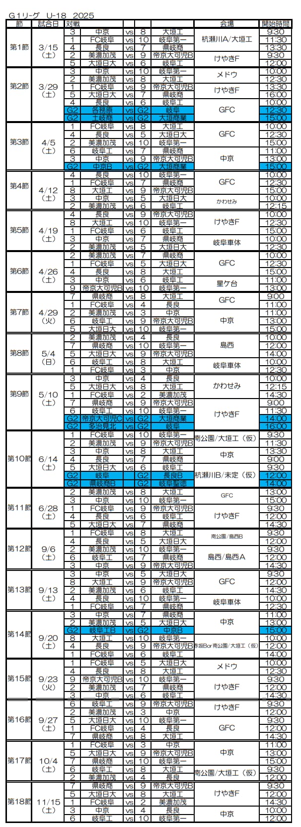 高円宮杯岐阜県ユースリーグ(Gリーグ)2025 1・2部