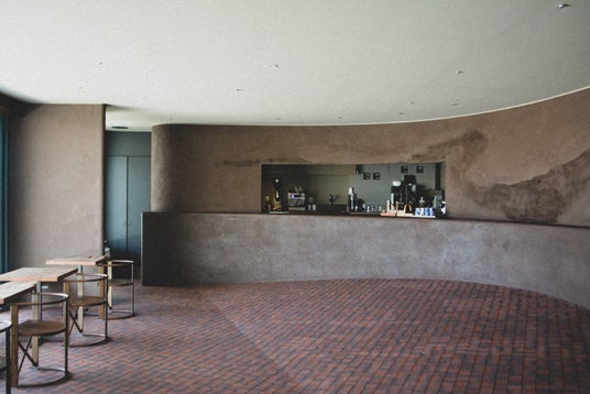 屋上広場や大橋の街並みとゆるやかにつながるよう、カフェカウンター前の床には緩やかな傾斜を設け、高低差による空間の奥行きを演出。