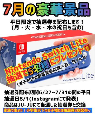 また、6月27日(金)~7月31日(木)の間の月、火、水、木曜日に《祝日も込》抽選券を配布します。5名様に「Nintendo Switch Lite (色/ブルー)」が当たるチャンスです。