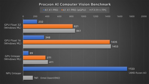 最後はAI性能の比較。CPU内蔵GPUとeGPU、大型デスクトップPCのGPUとの比較に加えて、NPUの結果もグラフ化している。ここでポイントとなるのが、AI X1 PROのようなモバイル向けのCPUを搭載するミニPCは、強力なNPUを搭載する(モデルもある)こともメリットだということ。