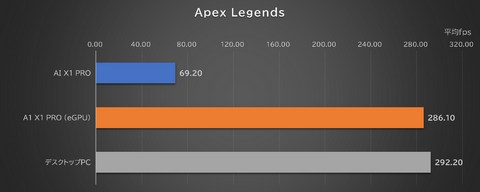 まずは比較的軽量なタイトルである「Apex Legends」から。解像度は1,920×1,080ドットとし、フレームレートを無制限(上限300fps)、画質に関わるオプションをすべて最高に設定した(フレーム生成は対応していない)。下記は訓練場で一定のルートを2分間歩行したときの平均フレームレートをグラフ化したものとなる。