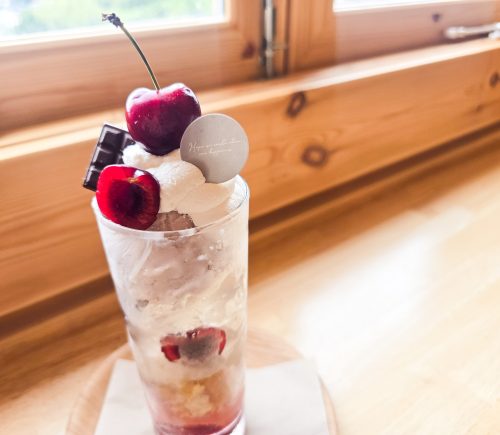 こちらの「アメリカンチェリーパフェ」のベースは、アメリカンチェリー・チョコ・ホイップクリーム・アイス・エルダーゼリー・パイ・アメリカンチェリーコンポート。