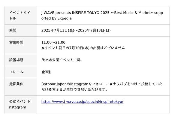 キタムラ・ホールディングス グループのピックハイブ株式会社(本社:東京都新宿区、代表取締役社長 兼 COO:大迫 由典)は、2025年7月11日(金)~2025年7月13日(日) の期間で、音楽とマーケットを融合した都市型カルチャー・フェス「J-WAVE presents INSPIRE TOKYO 2025 ~Best Music & Market~ supported by Expedia」(以下、INSPIRE TOKYO 2025)の英国ライフスタイルブランド<バブアー>のブースに、オリジナルフレームで撮影できるフォトブースを設置します。