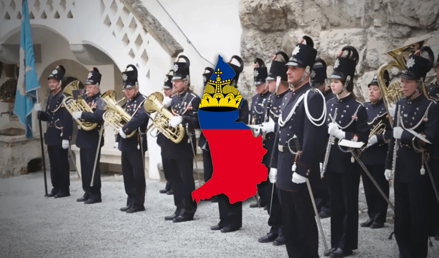 Lはリヒテンシュタイン連隊と制服を探していましたが、古い軍の旗を見ましたが、このミュージシャングループに目を向けると、青い旗を持っているofemは、それが何を意味し、どのように見えるのか疑問に思います Liechtenstein