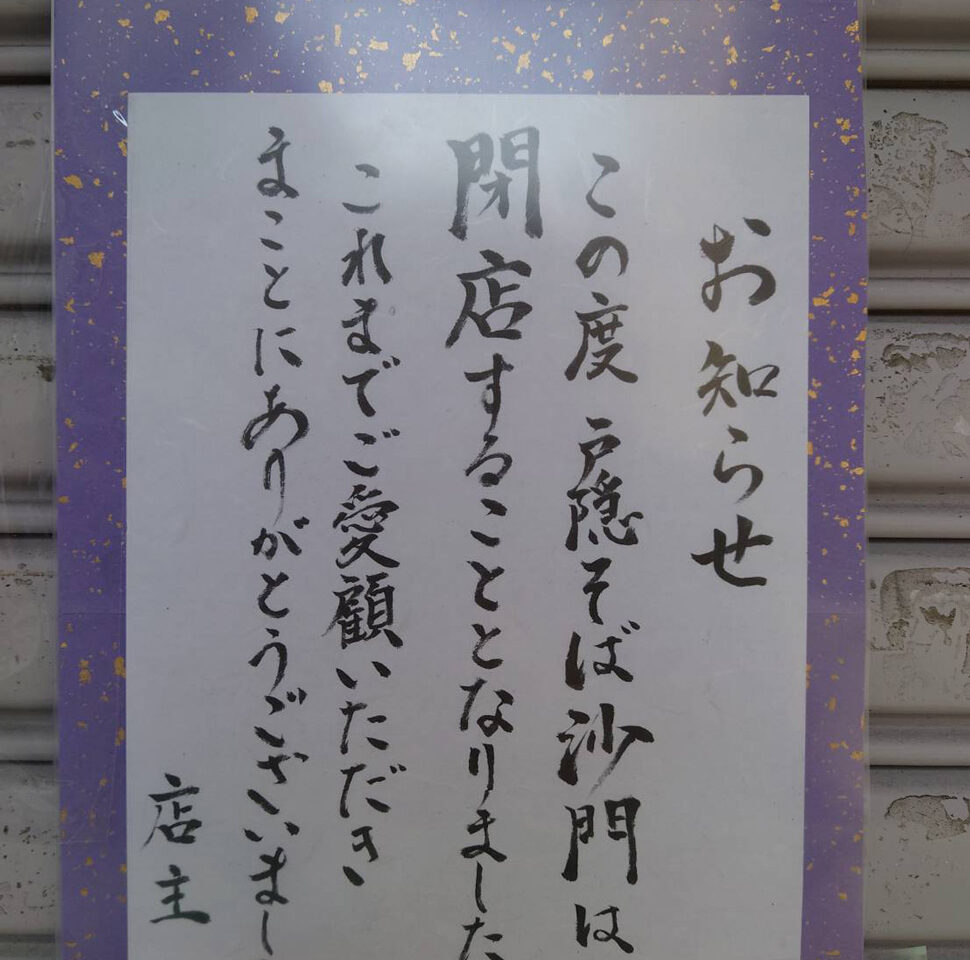 大宮町2丁目にあり、惜しまれつつ閉店した戸隠そば 沙門(しゃもん)」。